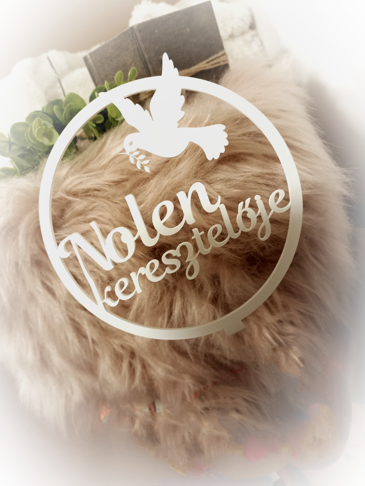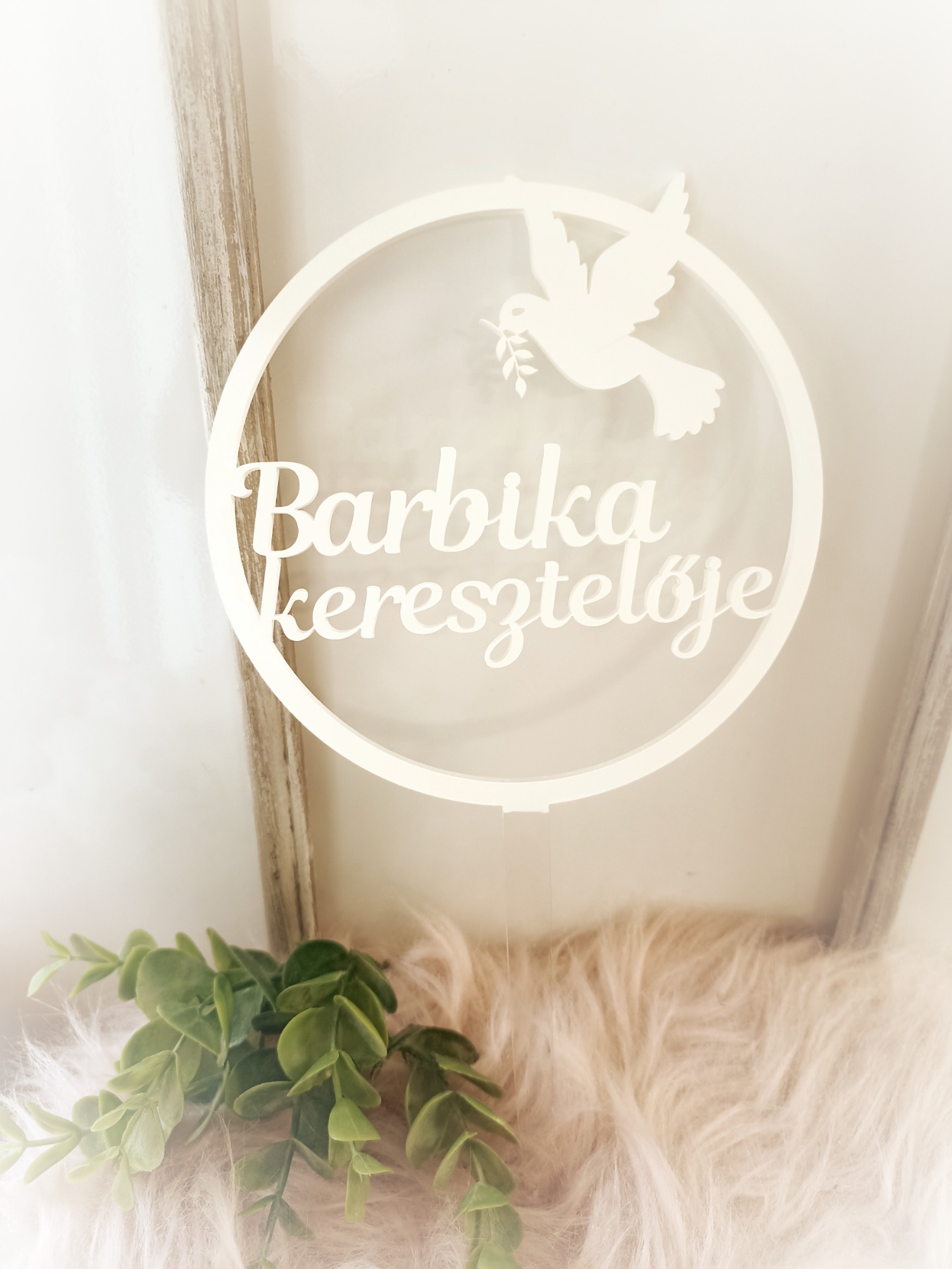 14 cm széles keresztelő tortadísz fehér színben.A kért nevet megrendeléskor a Megjegyzés rovatban lehet megadni.