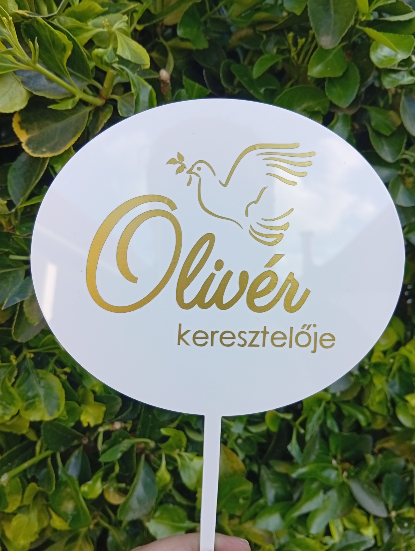 13 cm széles keresztelő tortadísz fehér alapon arany felirat.A kért nevet megrendeléskor a Megjegyzés rovatban lehet megadni.
