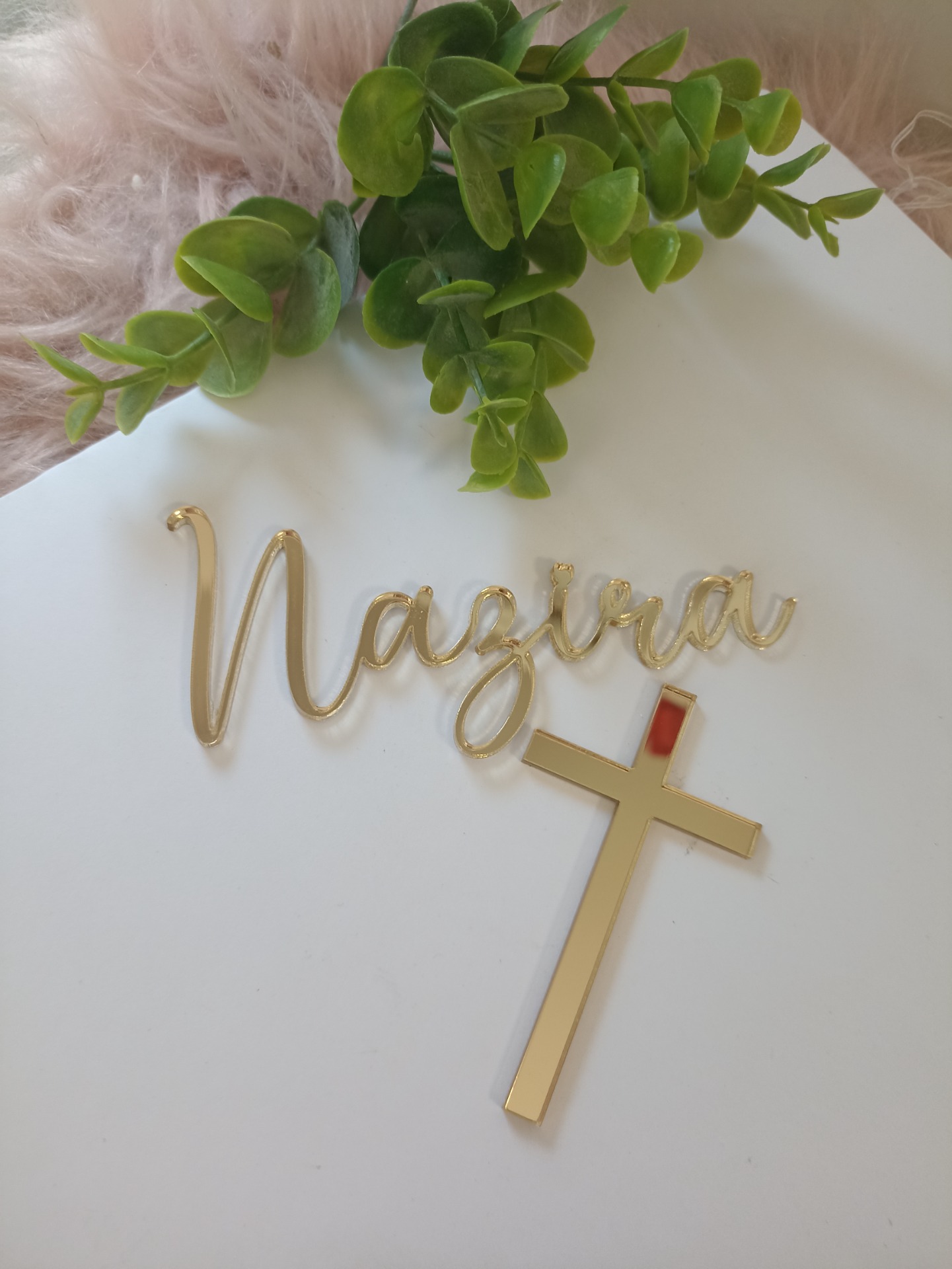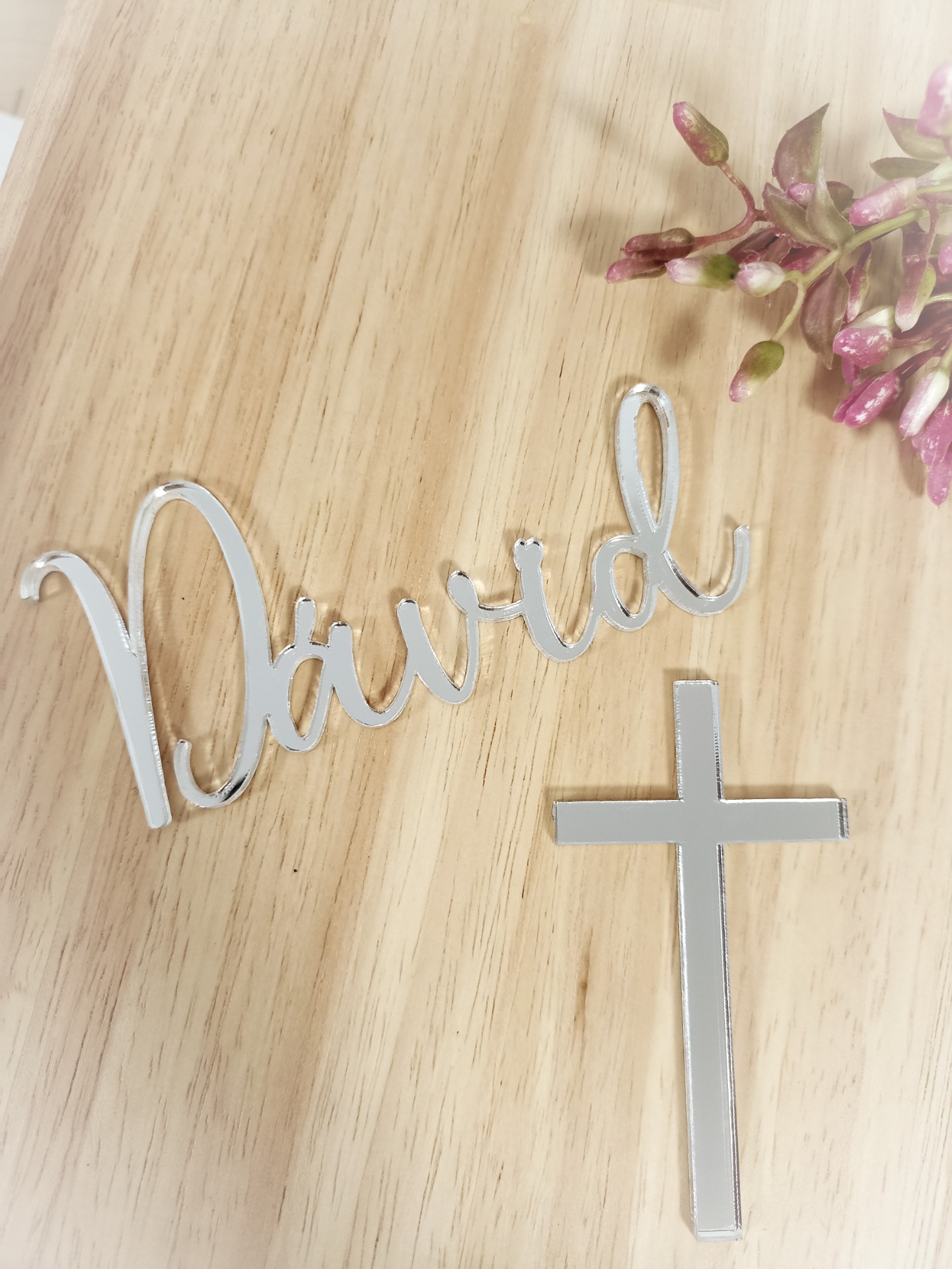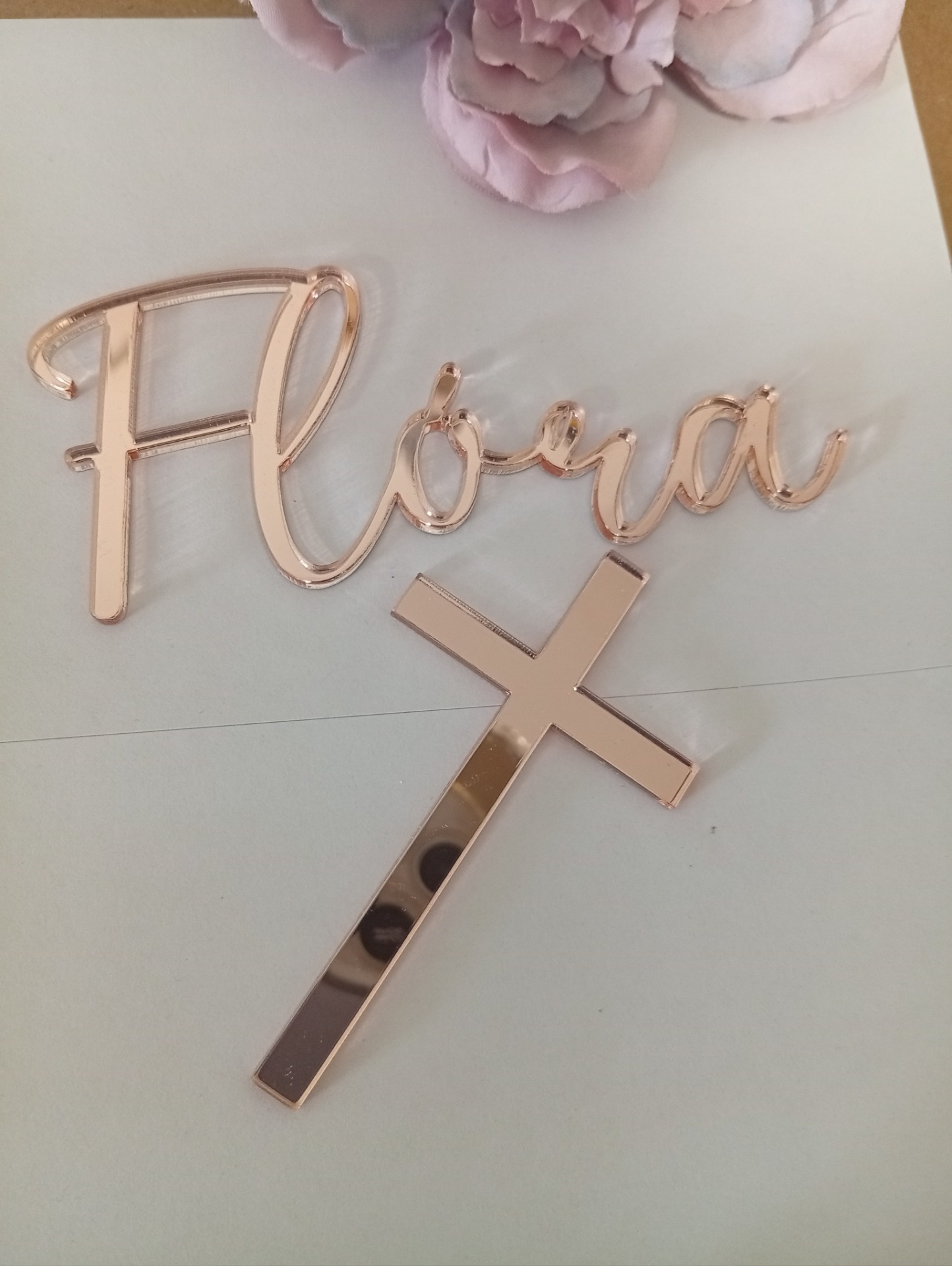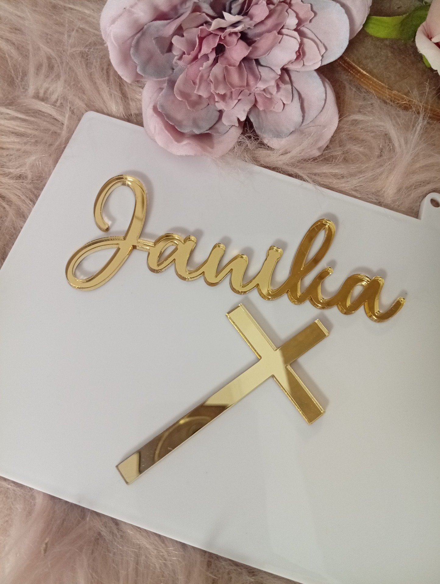 10-12 cm széles(névtől függ) lézer vágott tükörplexi egyedi tortadísz és egy 8 cm-es kereszt a torta oldalára(beszúró nélkül). A nevet megrendeléskor megjegyzésben lehet megadni.